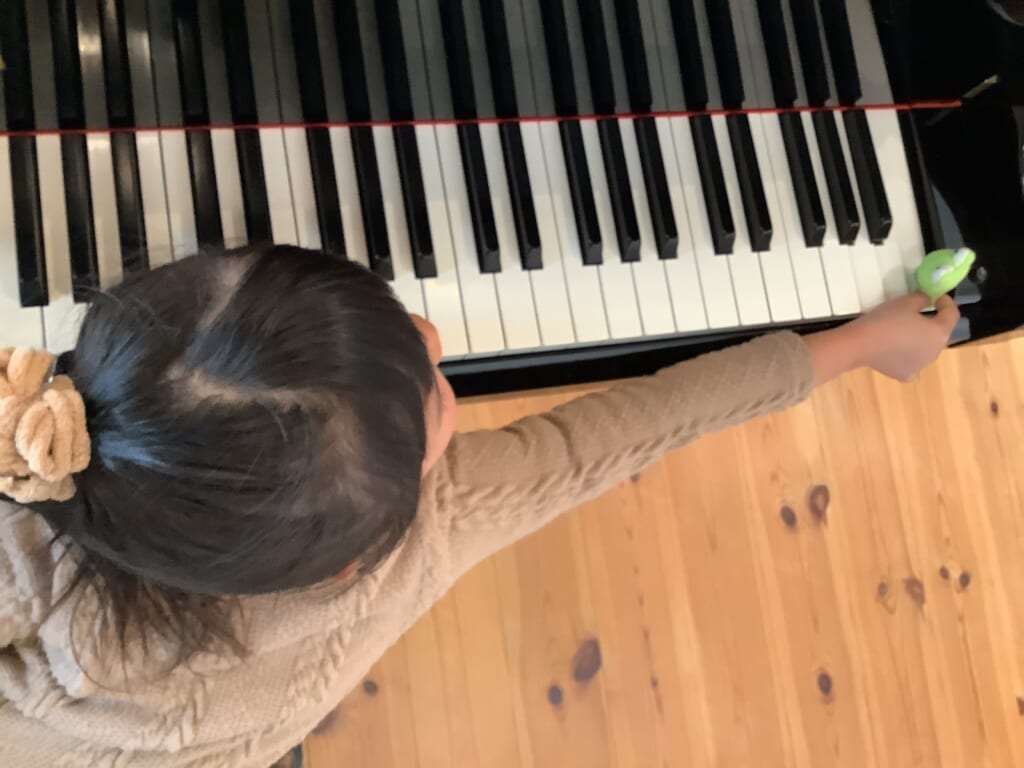 ふくろうさんの音楽教室のピアノコースは座ってばかりのレッスンでなく、時にお手玉、時にグロッケン、時にバランスボール…と様々な切り口でピアノに近付いていきます。